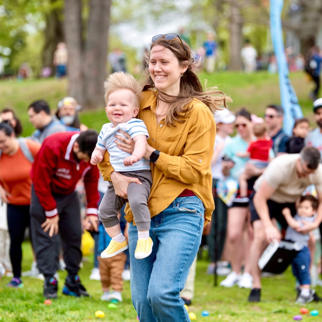 Free egg hunts every 10 min, Easter Bunny pics, petting zoo, and inflatables at Wilson Farm Park.