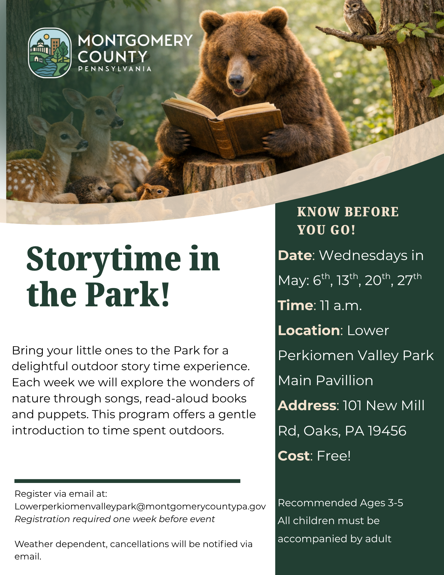 Bring your little ones to the park for a delightful outdoor story time experience. Each week, children will explore the wonders of nature through songs, read-aloud books and puppets. This program offers a gentle introduction to time spent outdoors. weather dependent; pre-registration via email at : lowerperkiomenvalley@montgomerycountypa.gov Wednesday May 6th,13th, 20th and 27th. 11:00 AM- 12:00 PM