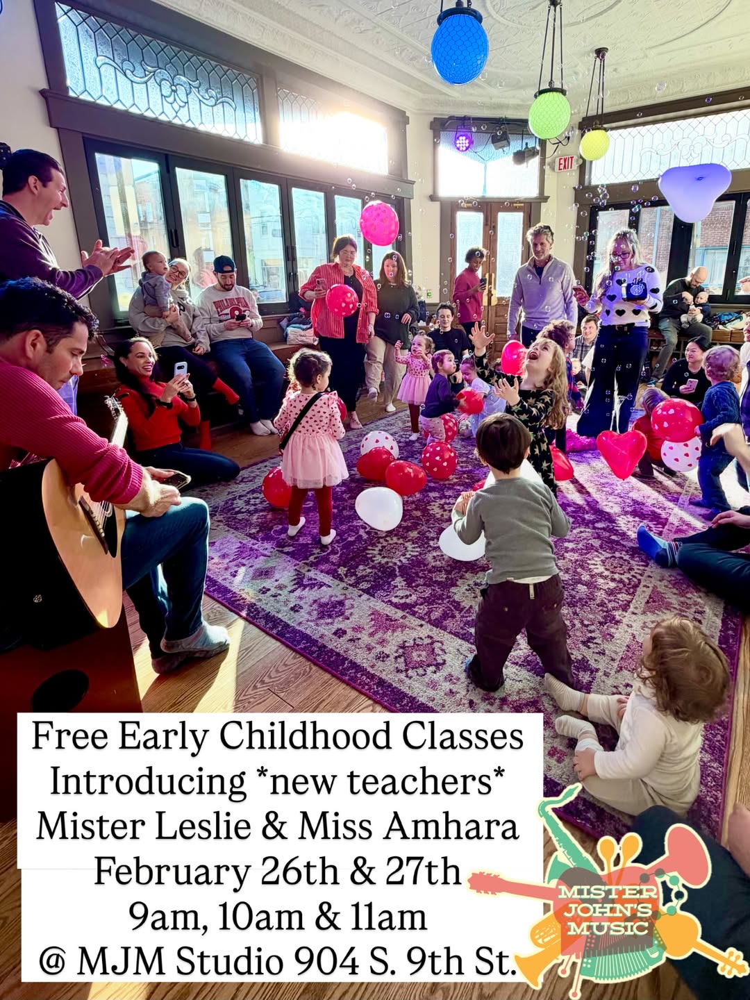 Mister John's Music is introducing two new teachers — Mister Leslie and Miss Amhara — with two free days of early childhood music classes (ages 0-3). Three session times: 9am, 10am, and 11am. Space is limited, registration required.